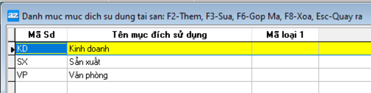 Danh mục mục đích sử dụng khai báo các mục đích sử dụng tài sản cố định.
