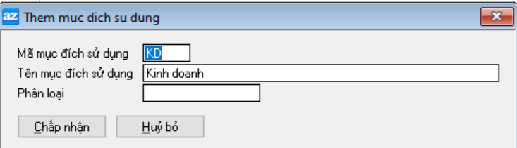 1. Vào menu Danh mục\Danh mục mục đích sử dụng.