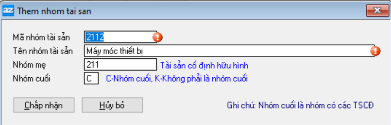 | Mã nhóm | Mã nhóm tài sản, lưu trữ tối đa 16 ký tự. |