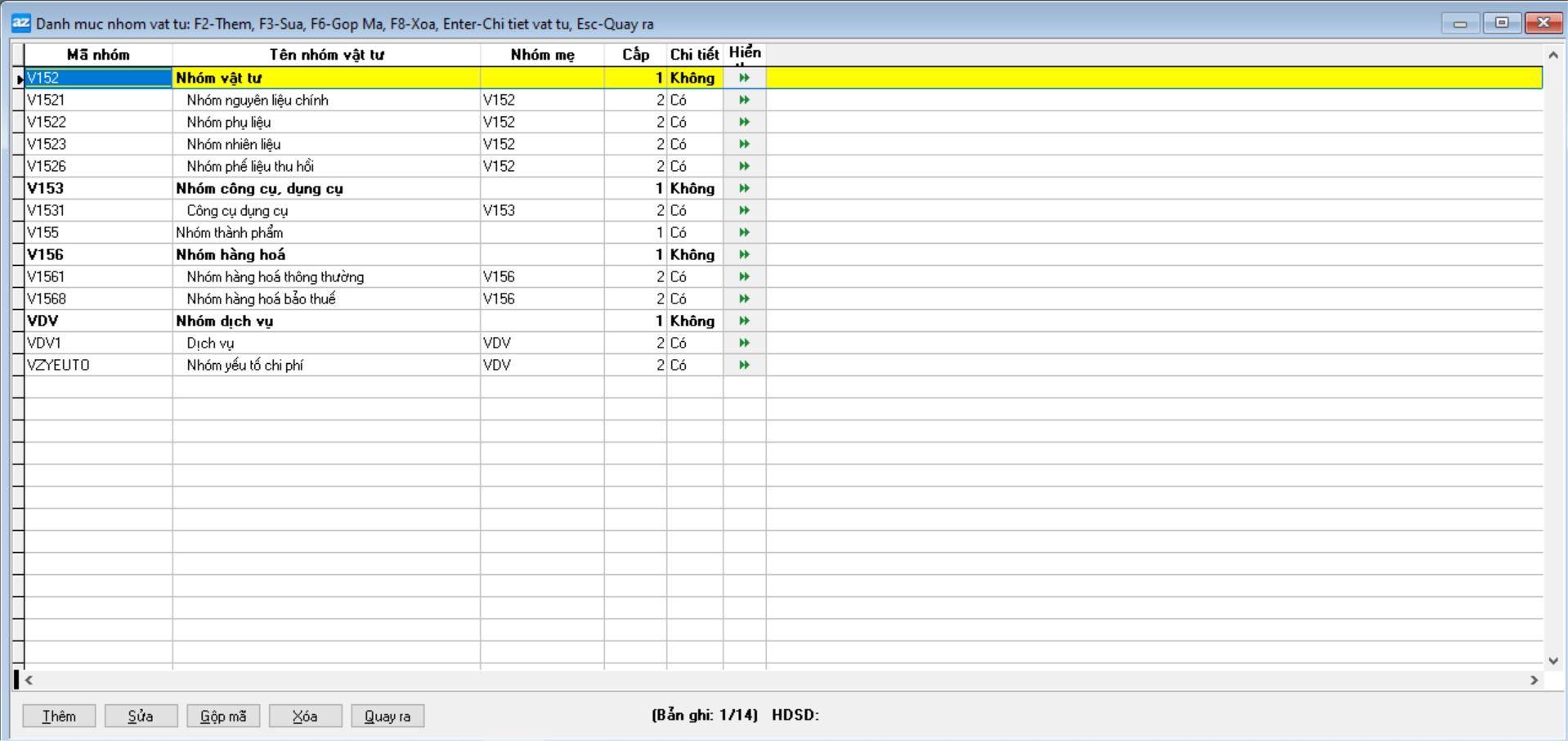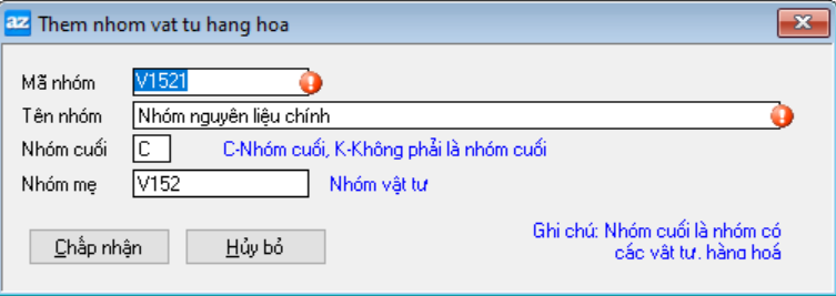 | Nhóm cuối | Nhận hai giá trị [C] / [K], nếu là nhóm cuối cùng thì trong nhóm không còn nhóm con nữa mà chỉ có các vật tư hàng hoá. |