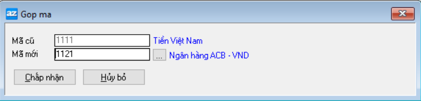 Bước 1: Từ màn hình chính của một danh mục bất kỳ, chọn tới dòng chứa "mã" cần gộp rồi nhấp chọn nút “Gộp mã” (hoặc nhấn phím F6), màn hình gộp mã xuất hiện (dưới đây là màn hình gộp mã danh mục tài khoản).