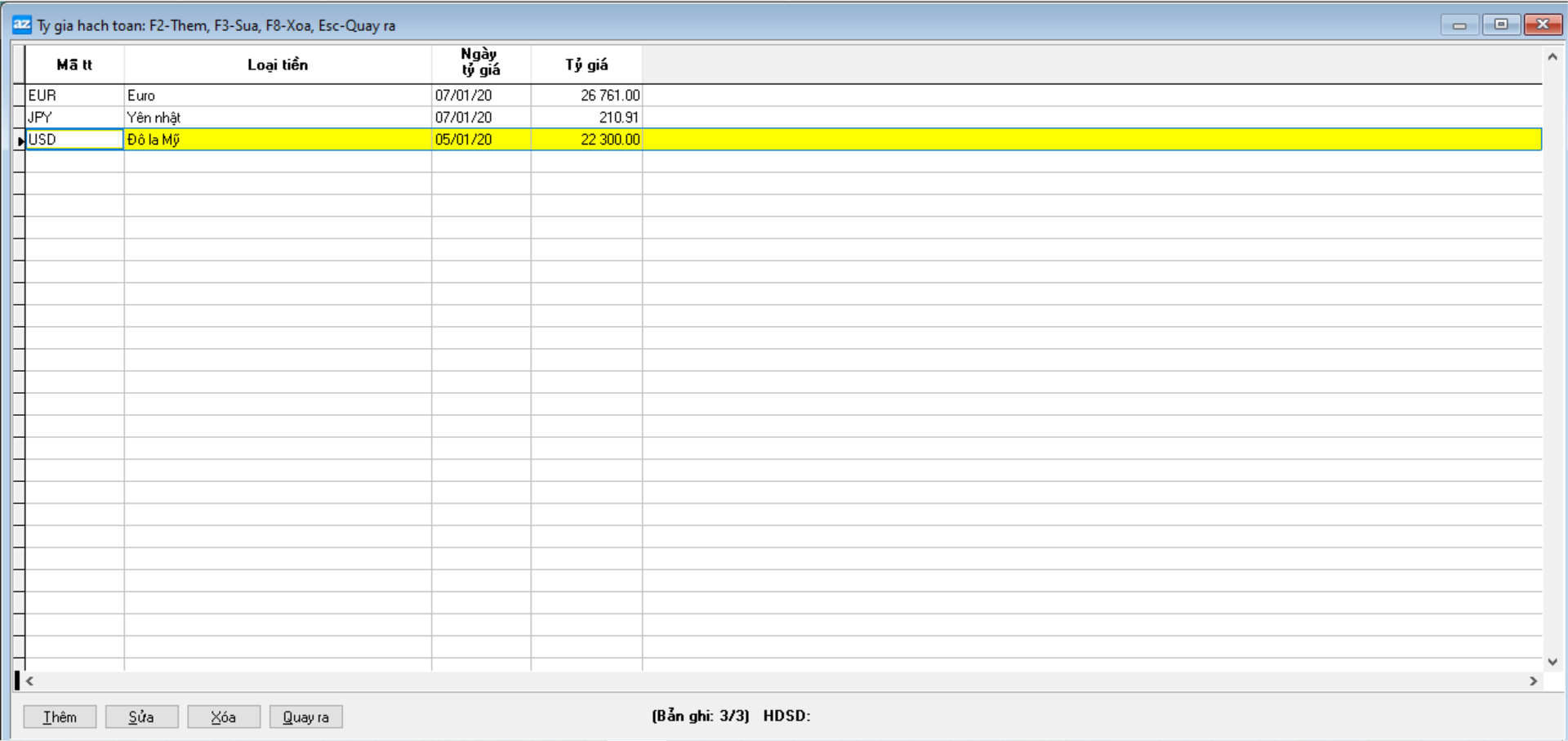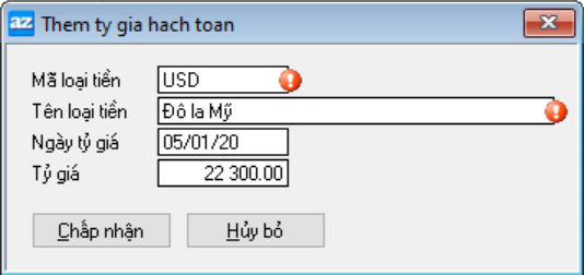 Khai báo tỷ giá quy đổi giữa đồng tiền hạch toán và các đồng ngoại tệ khác theo trình tự thời gian. Tỷ giá này sẽ là căn cứ để chương trình tự động lấy lên làm tỷ giá mặc định khi nhập chứng từ.