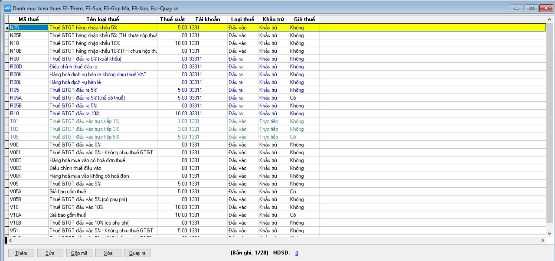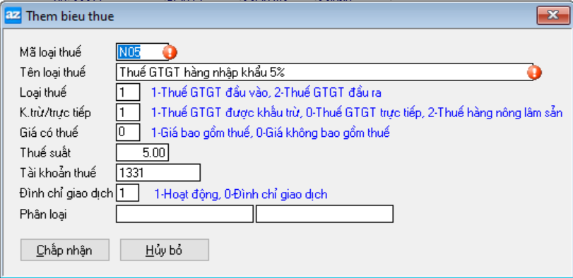 Danh mục biểu thuế dùng để khai báo, quản lý các loại hình thuế suất đầu ra, đầu vào. AZSOFT đã thiết lập sẵn đầy đủ danh mục biểu thuế. Kế toán có thể thêm hoặc sửa theo nhu cầu của doanh nghiệp.