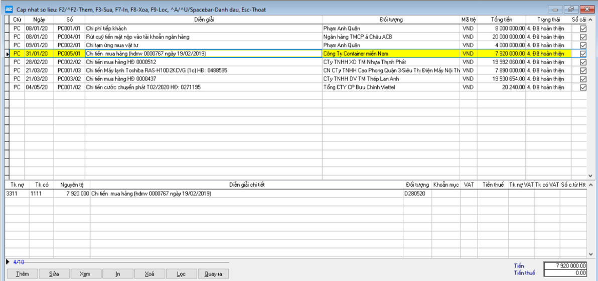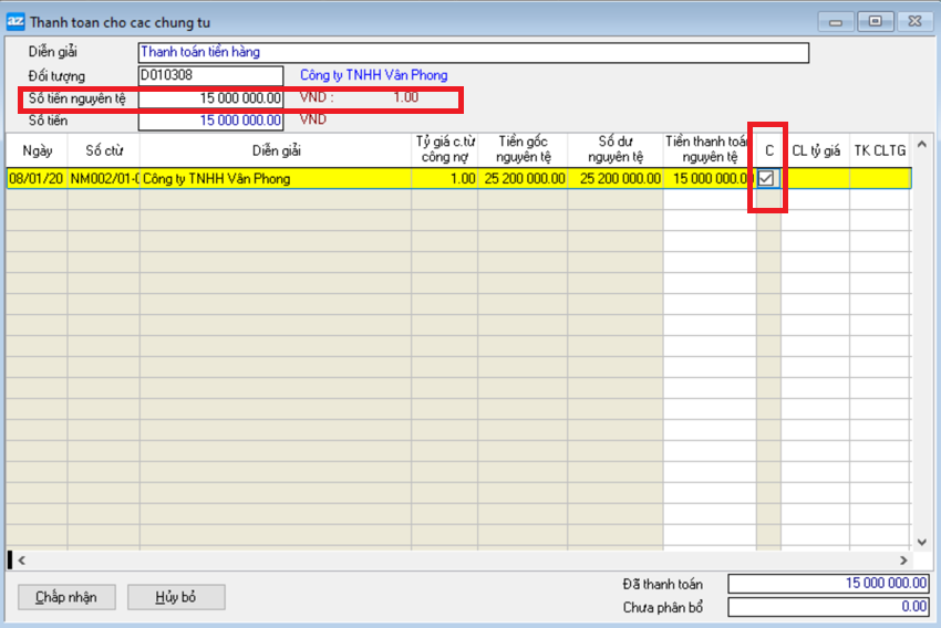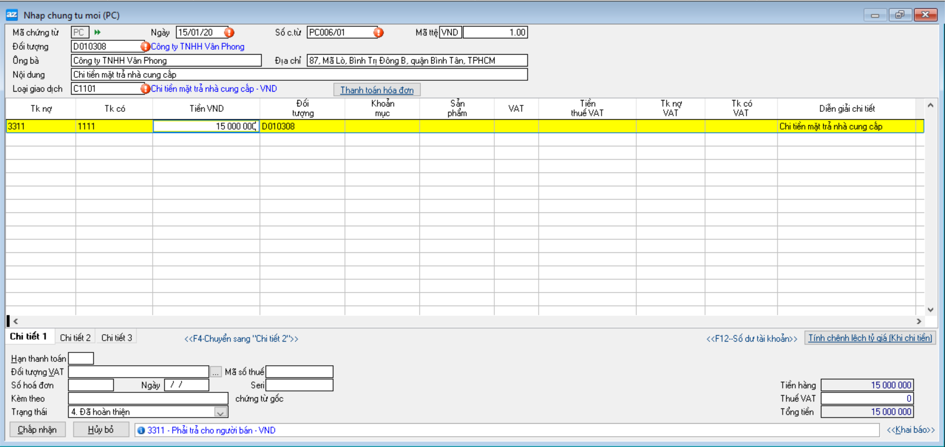 VD: Thanh toán tiền hàng cho Công ty TNHH Vân Phong (D010308) bằng tiền mặt với số tiền là 15 000 000đ.