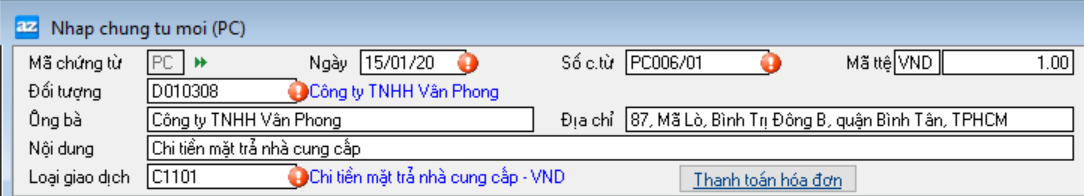 - Tại mục Loại giao dịch: chọn Loại giao dịch C1101 – Chi tiền mặt trả nhà cung cấp – VND