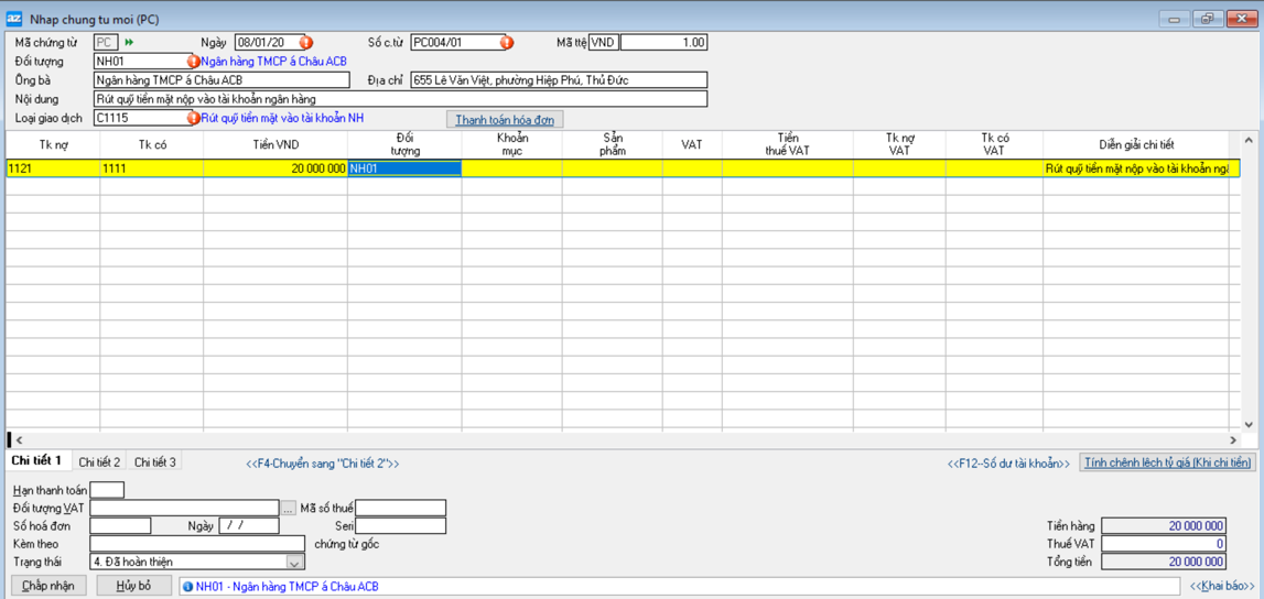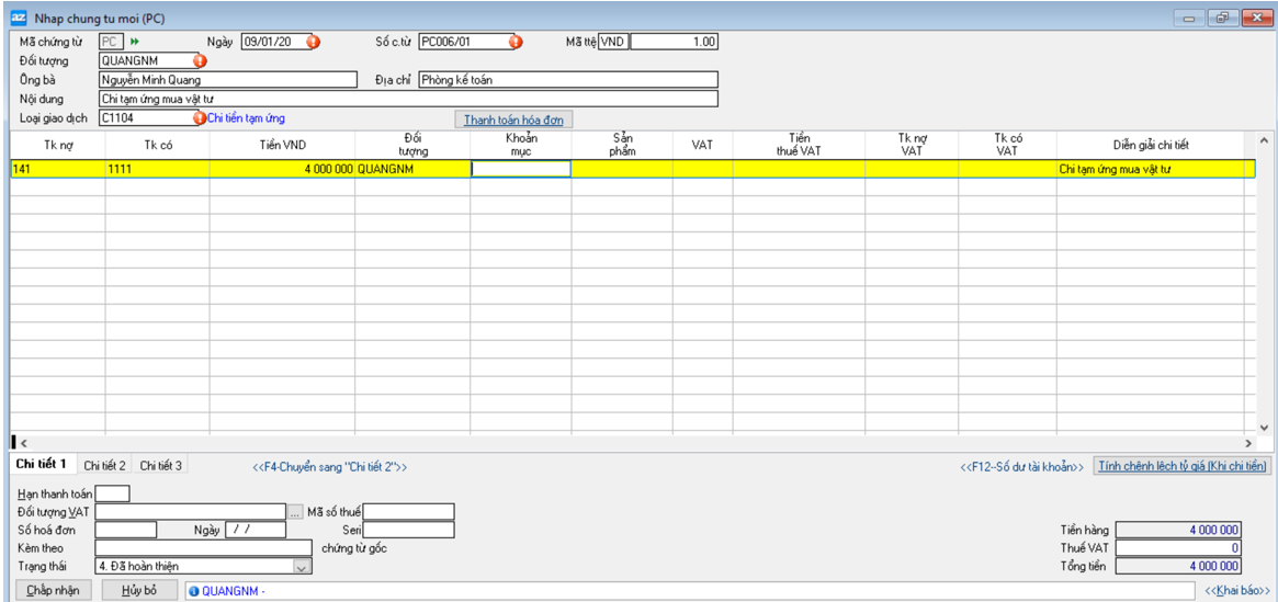 - Khai báo các thông tin chi tiết của phiếu chi: