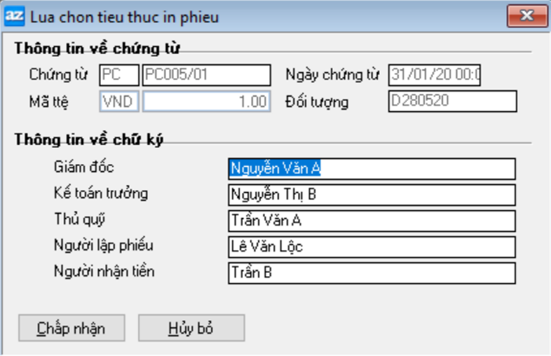 Hộp thoại “Lựa chọn tiêu thức in phiếu xuất hiện”. Nhập Tên thông tin về chữ ký.