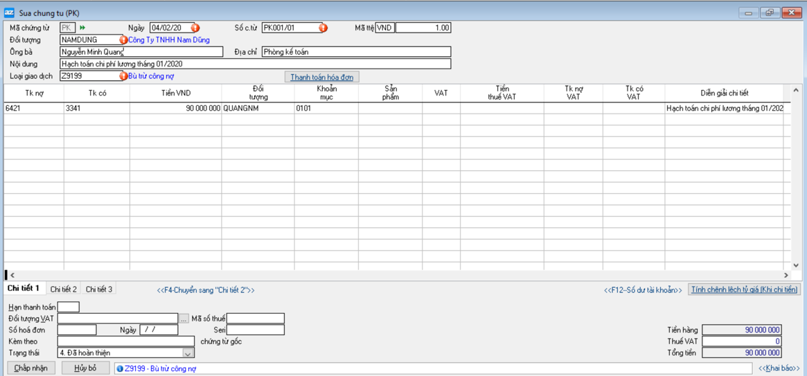 - Khai báo TK nợ và TK có và số tiền phát sinh tương ứng với từng dòng định khoản.