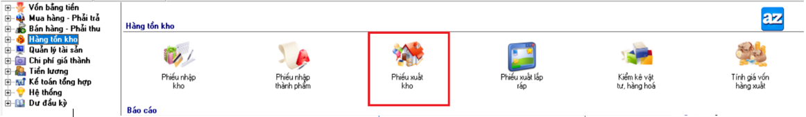 Bước 1: Vào phân hệ Hàng tồn kho chọn Phiếu xuất kho hoặc chọn (Du lieu\a. Phiếu xuất kho)