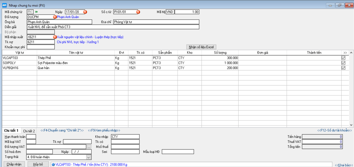 Bước 3: Nhập thông tin của vật tư, hàng hoá trong tab chi tiết