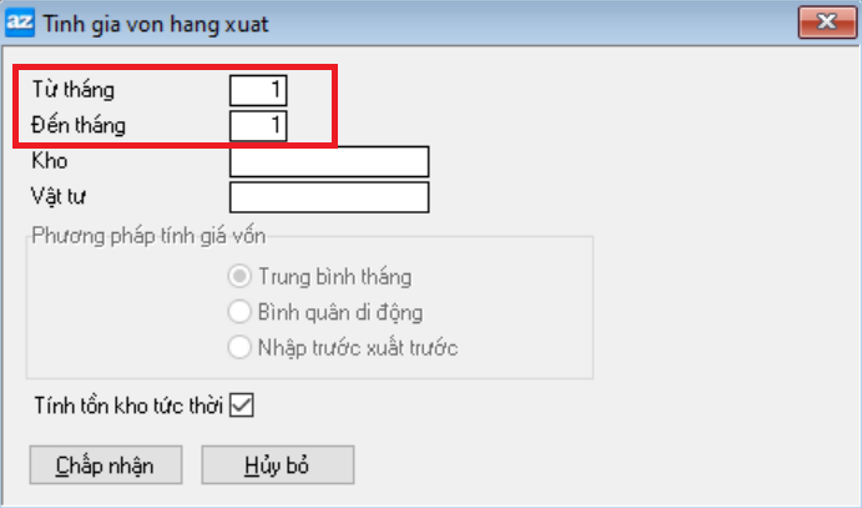 Chọn thời gian tính giá vốn và sau đó nhấn Chấp nhận hoặc Ctrl + Enter