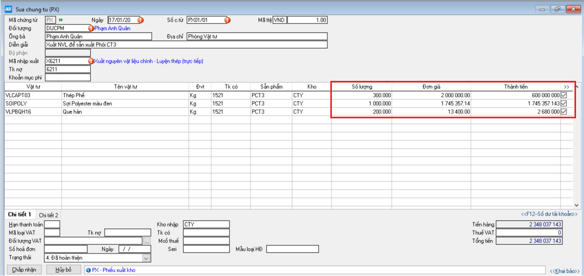Khai báo các thông tin chi tiết của phiếu xuất kho.