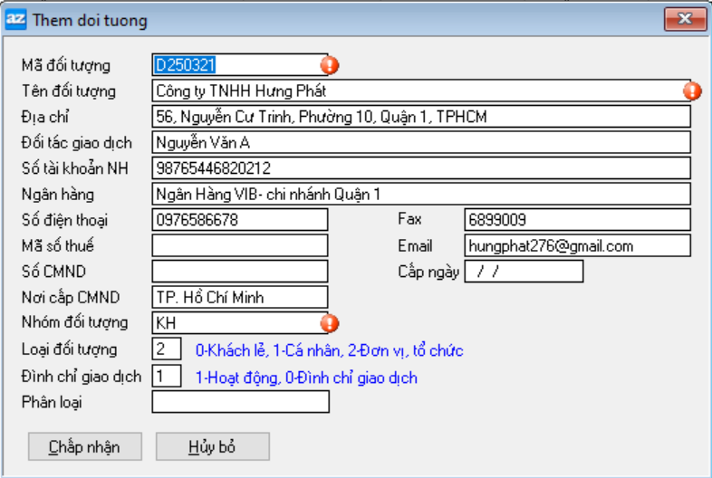 | Địa chỉ | Ðịa chỉ của đối tượng, dùng để in phiếu thu chi, nhập xuất. (nếu có), lưu trữ tối đa 48 ký tự. |