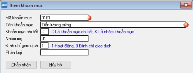 Chi tiết các thông tin về Danh mục Khoản mục phí: