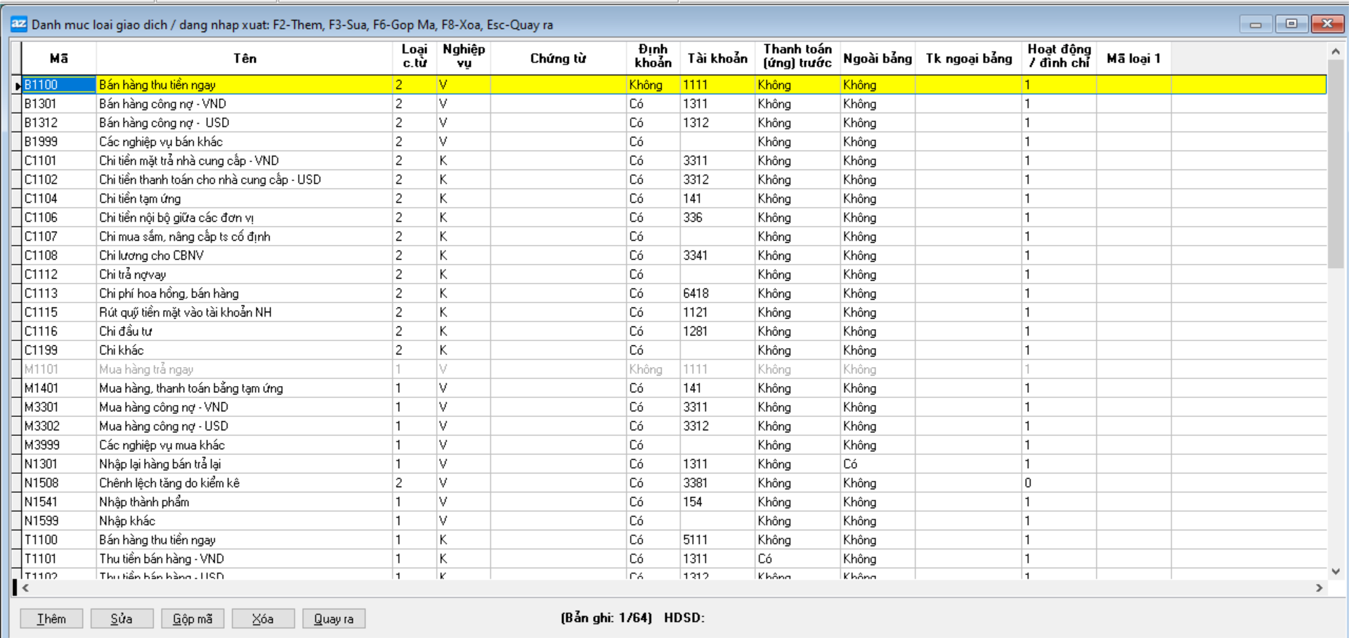 Danh mục loại giao dịch / dạng nhập xuất dùng để khai báo các loại giao dịch trên chứng từ kế toán và kiểu nhập xuất vật tư hàng hoá trên chứng từ vật tư, trong một số trường hợp còn được sử dụng để khử trùng chứng từ.
