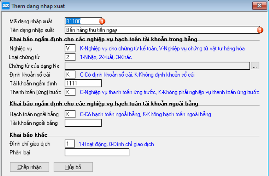 1. Vào menu Danh mục\Danh mục Loại giao dịch, Dạng nhập xuất.