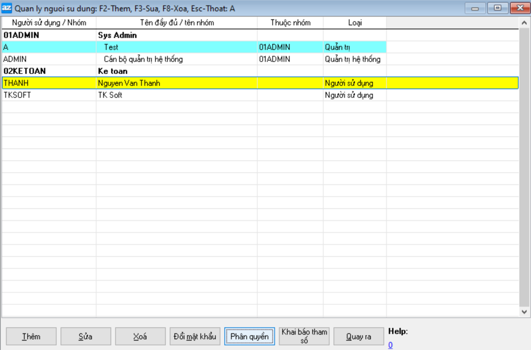 Từ hệ thống menu nhấp chọn “He thong\Quản lý người sử dụng” hoặc vào Phân hệ Hệ thống chọn Quản lý người sử dụng, hộp thoại liệt kê danh sách người dùng xuất hiện.