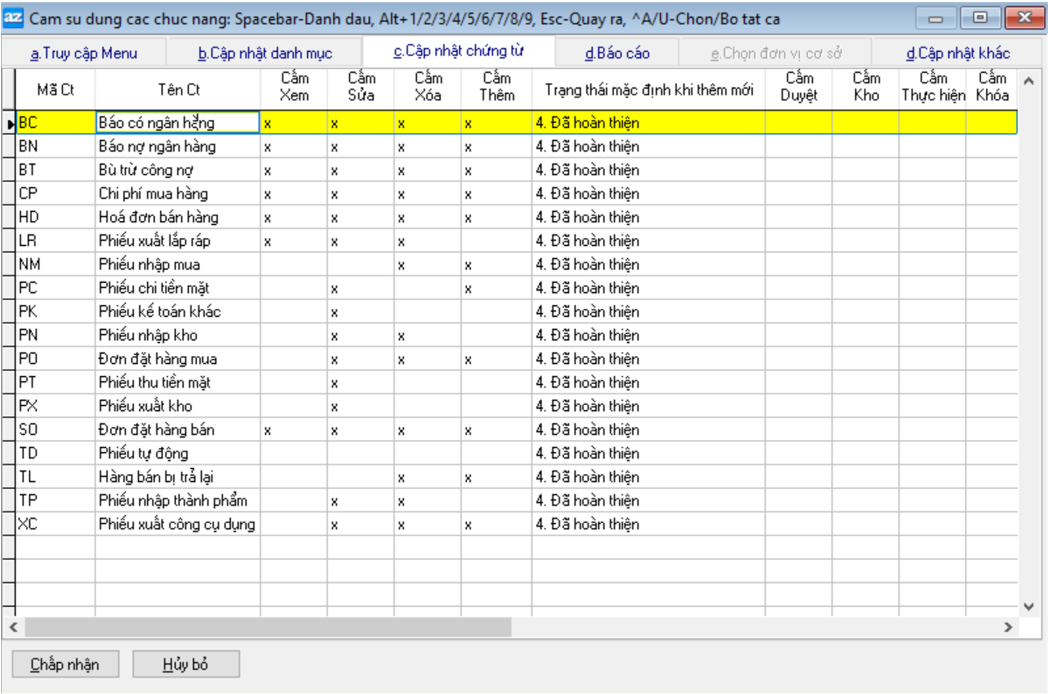 Nhấp chọn Tab “c. Cập nhật chứng từ” để phân quyền người sử dụng.