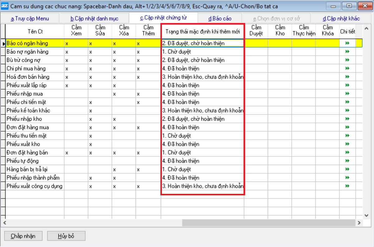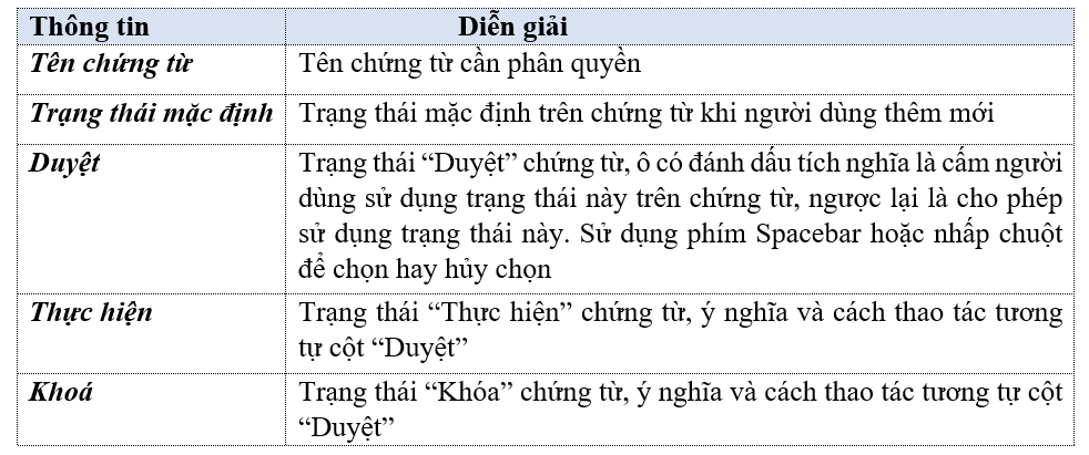 Dùng để phân quyền các trạng thái trên chứng từ, dưới đây là các bước thực hiện: