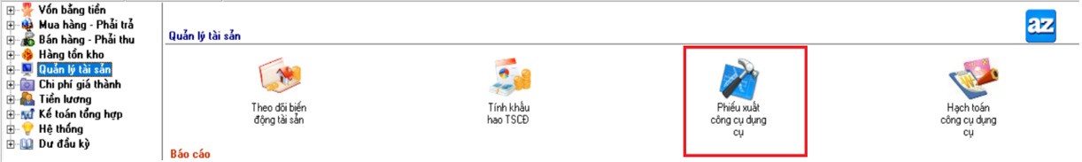 Bước 5: Lên báo cáo: Người sử dụng có thể tìm thấy các báo cáo liên quan đến chức năng này trong menu “Bao cao\Báo cáo tài sản cố đinh – công cụ, dụng cụ”.