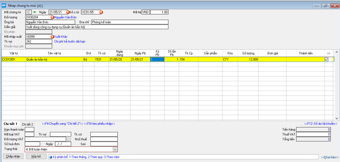 Trong màn hình cập nhật công cụ dụng cụ xuất dùng các thông tin trong Tab “Chi tiết 1” như “Ngày dùng”, “Ngày Pb”, “Kỳ Pb”, “Số lần Pb”, “Tk Cp” sẽ là căn cứ để chương trình tự động tạo ra các dòng phân bổ chi tiết. Người sử dụng cũng có thể theo dõi các thông tin khác như giá trị đã phân bổ (“Ðã phân bổ”), “Mục đích”, “Ngày hỏng” trong Tab “Chi tiết 2” của màn hình này.