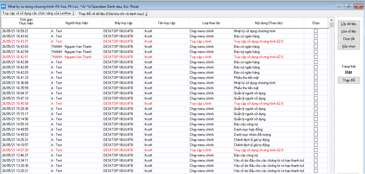 - Màn hình “Nhật ký sử dựng chương trình” xuất hiện, Tab thứ nhất của cửa sổ này liệt kê những chức năng mà người dùng đã truy cập.