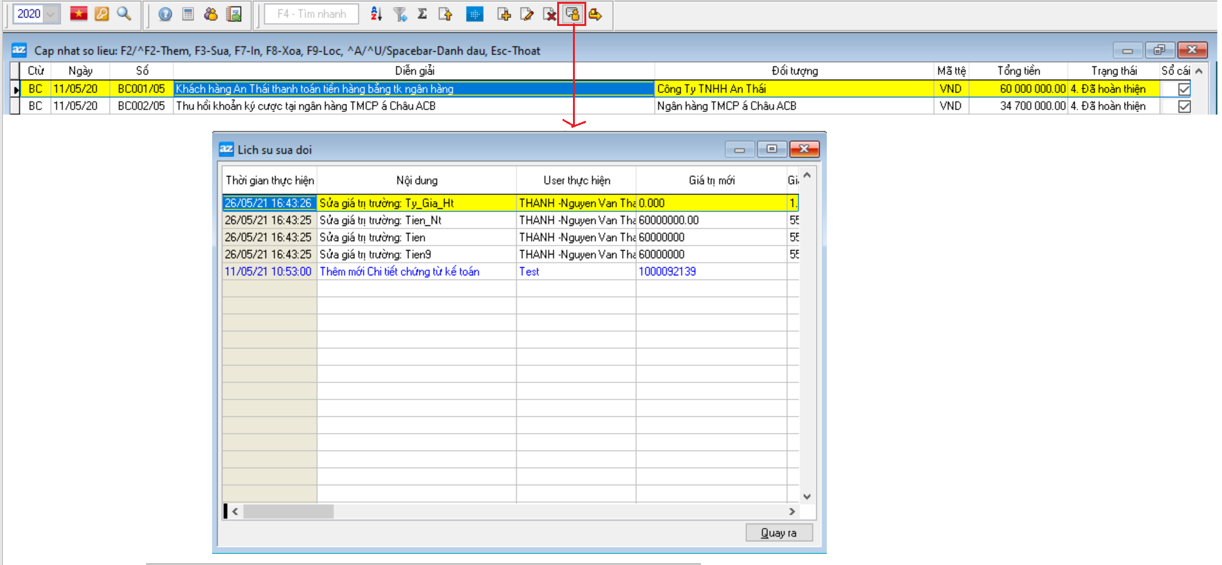 - Nhấp chọn nút “Lịch sử sửa đổi” trên thanh công cụ, một hộp thoại liệt kê danh sách các tác động của người dùng đến chứng từ này xuất hiện, nội dung trong danh sách này cho biết những ai đã truy cập, truy cập tại thời điểm nào và tác động những gì lên chứng từ đó.