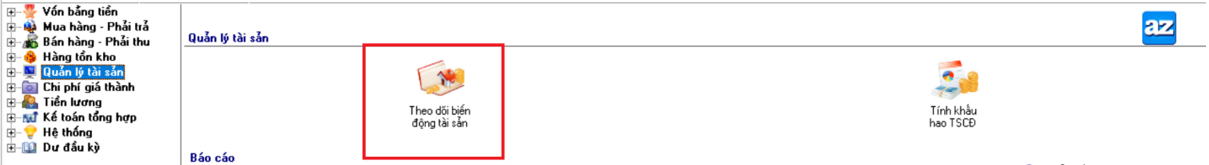 - Từ menu chọn “Du lieu\Theo dõi biến động tài sản” hoặc vào phân hệ Quản lý tài sản chọn Theo dõi biến động tài sản.
