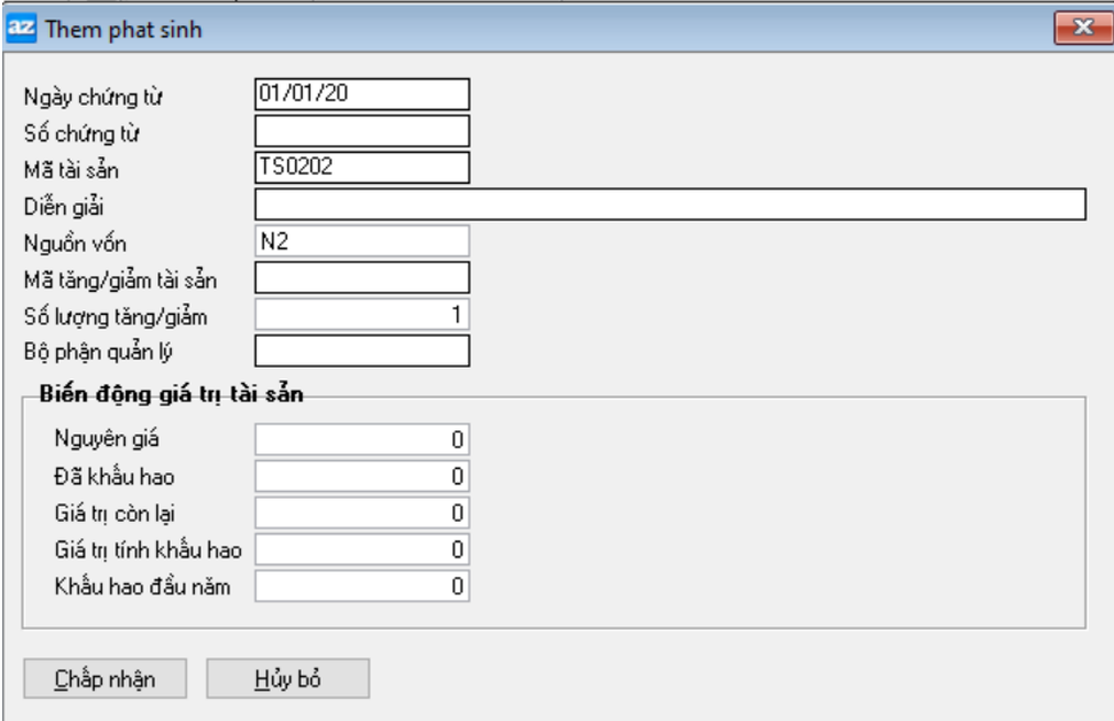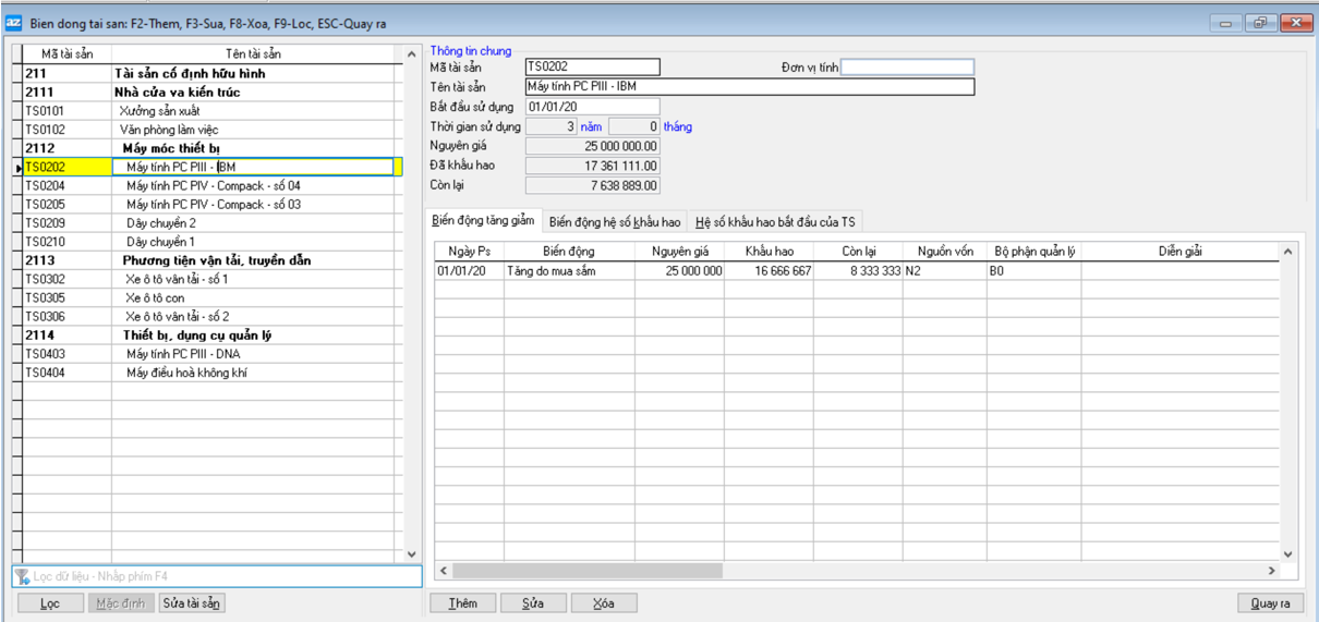 Từ đây chúng ta có thể thêm, sửa, xóa những biến động tài sản cần quản lý. Nhấn F2 hoặc Thêm để hiển thị thông tin thêm phát sinh của tài sản.