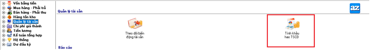 - Từ menu chọn “Tong hop\Tính khấu hao TSCД hoặc vào phân hệ Quản lý tài sản chọn Tính khấu hao TSCĐ