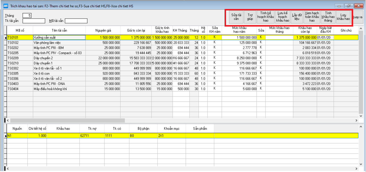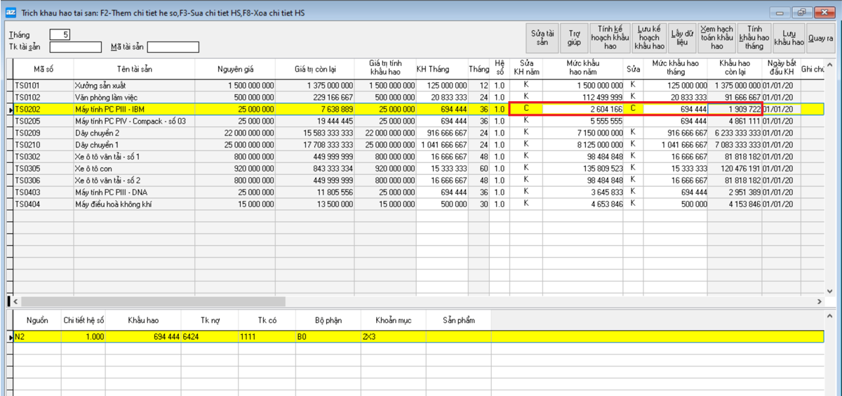 - Lưu ý: Người dùng có thể sửa lại giá trị khấu hao tháng cho mỗi tài sản cố định bằng cách sửa lại giá trị là [C] cho cột "Sửa" trong màn hình “Trích khấu hao tài sản”, sau đó sửa trực tiếp giá trị khấu hao trên cột “Mức khấu hao tháng”.